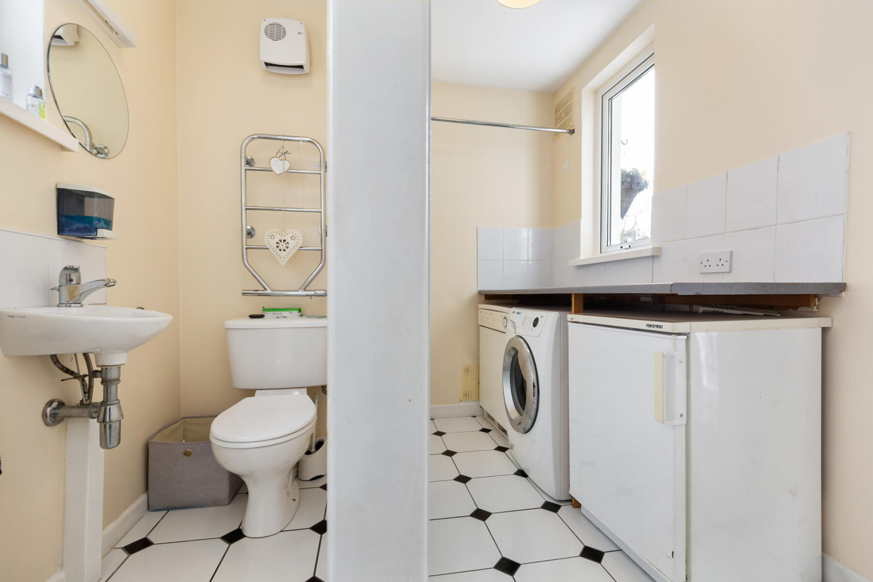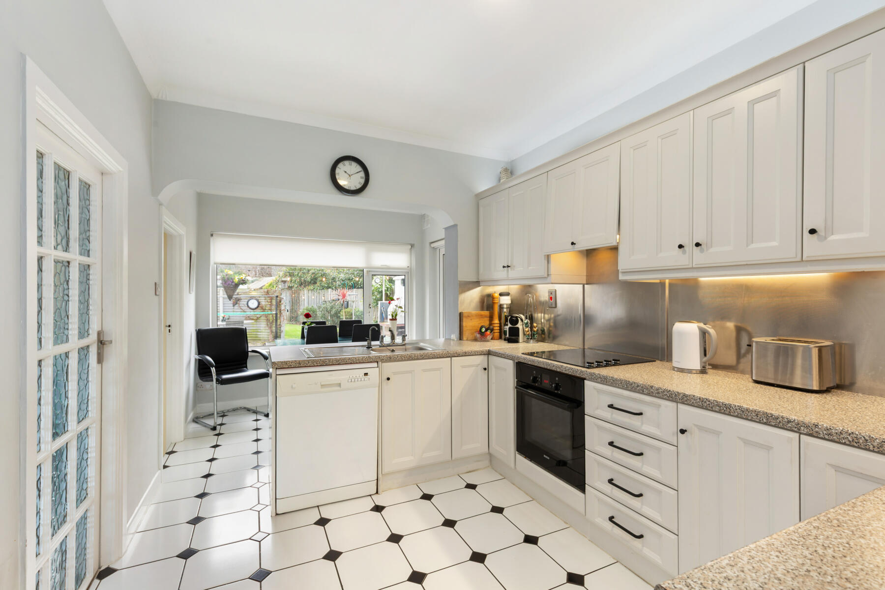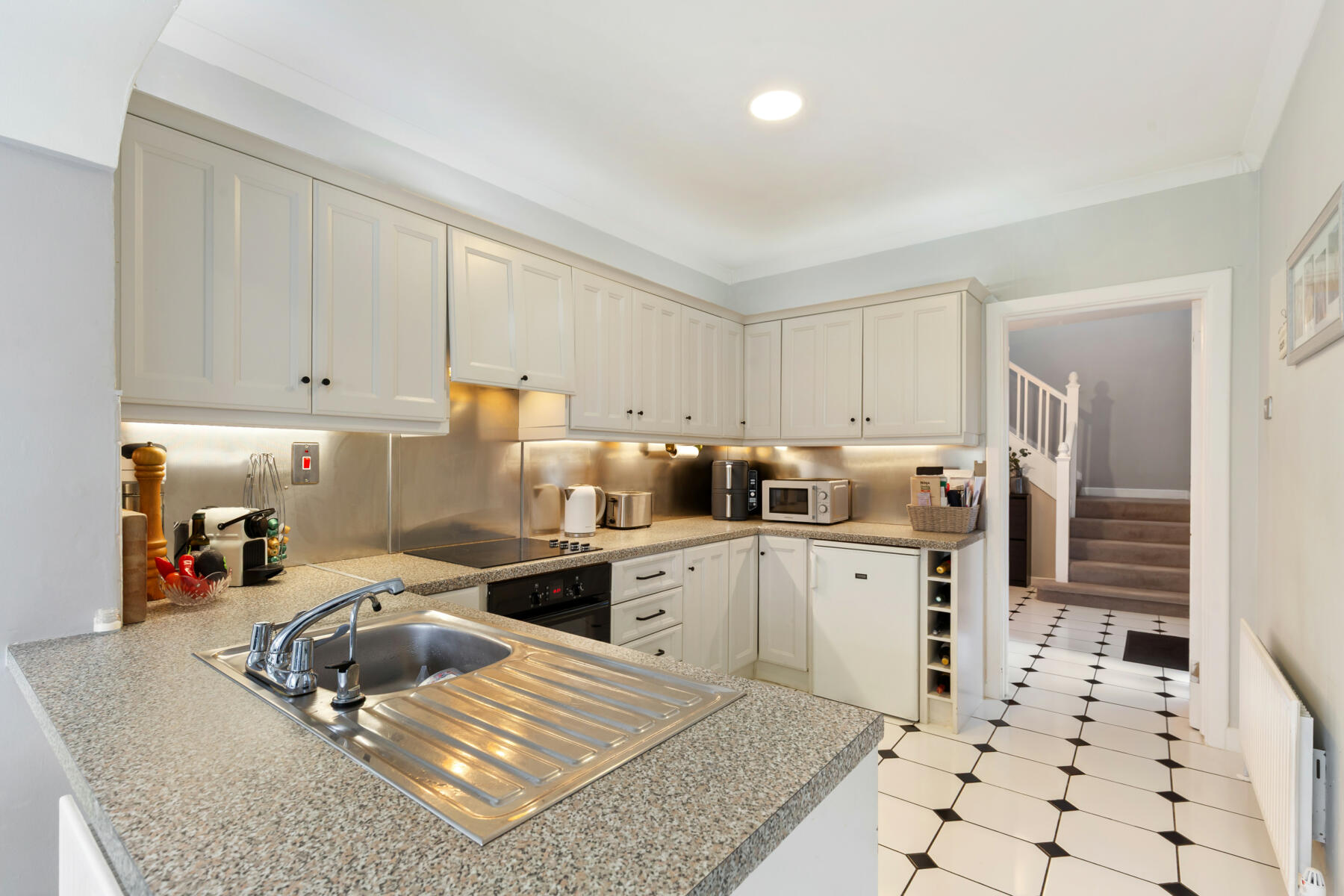 To the rear of the property lies a fully fitted open-plan kitchen, thoughtfully designed with an L-shaped countertop that doubles as an island. The dining area within the kitchen is enhanced by a large rear window and floor-to-ceiling double glass doors, maximising the natural light from the south-facing garden. A second living room is accessed from the kitchen, offering additional family space. A utility room and guest WC complete the ground floor accommodation.